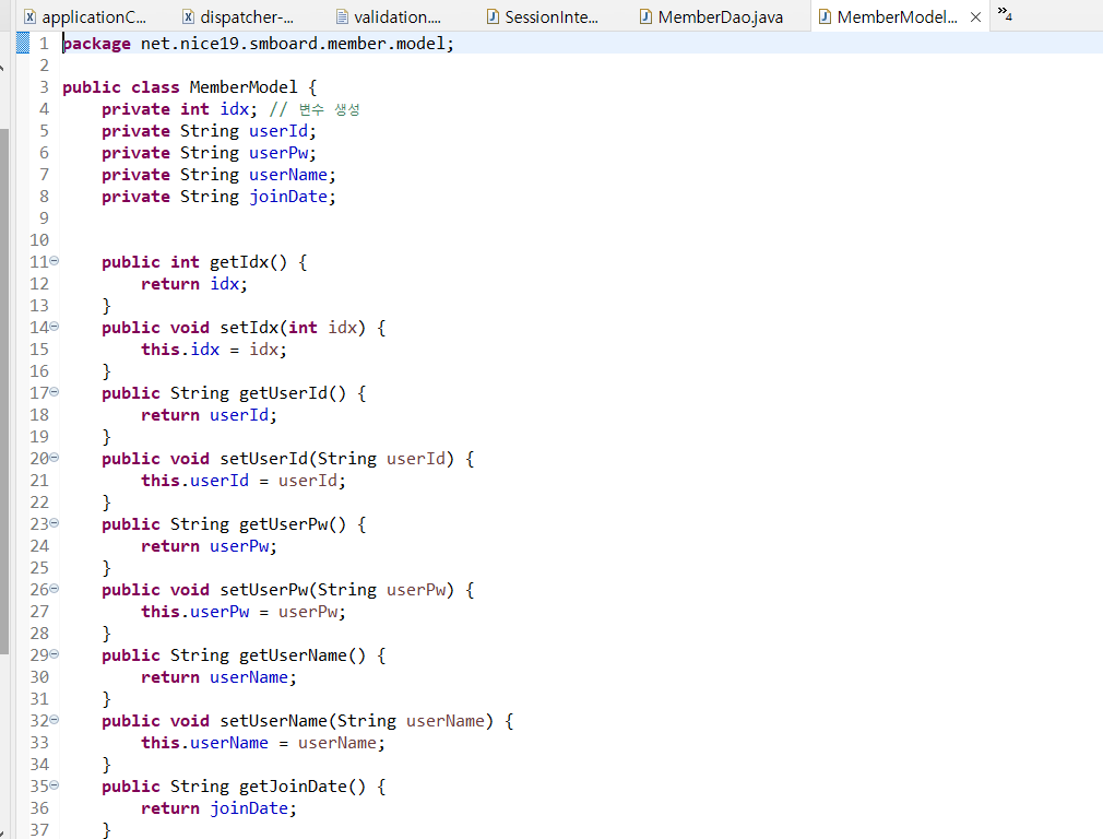 db와 연동할 자바 빈set get메소드도 만들어주고