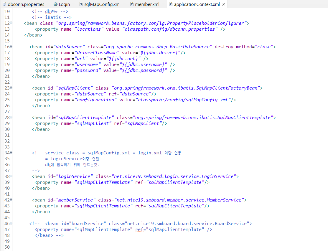 datasource로 접속할수있게 property를 설정해주고 bean으로 객체에 내려줄수있게 설정한다.