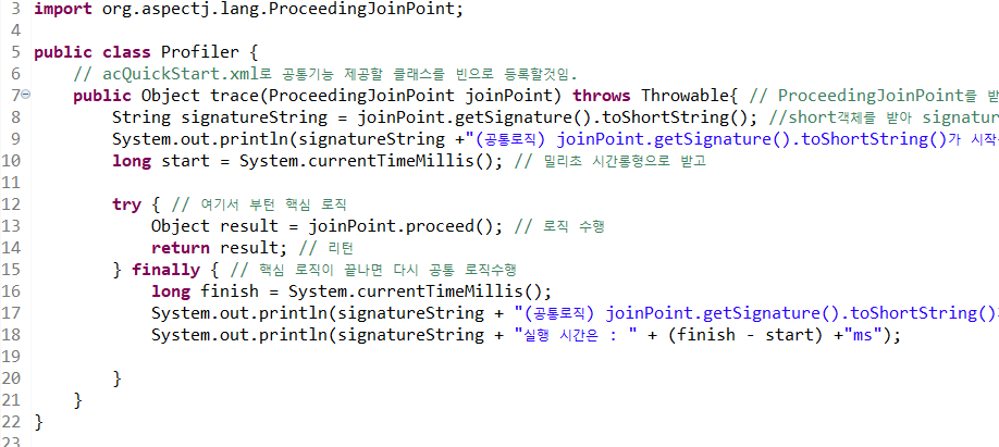 그렇게되면 공통로직을 사용할수 있는 상태가되며 public 메서드가 호출이 되면 profiler클래스의 trace()메서드가 Around Advice로 적용된다.