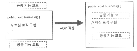 AOP프로그래밍에선 AOP라이브러리가 공통 기능을 알맞게 삽입해주기 때문에, 개발자는 게시글 쓰기나 목록 읽기와 같은 핵심 로직을 구현할 때 트랜잭션 적용이나 보안 검사와 같은 공통적으로 사용하는 기능을 처리하기 위한 코드를 핵심로직에 삽입할 필요가 없다, 핵심 로직을 구현한 코드에 공통 기능 관련 코드가 포함되어 있지 않으므로 적용해야할 공통 기능이 변경되더라도 핵심 로직 구현 코드를 변경할 필요가 없다. ( 공통 기능 코드만 변경한뒤 핵심 로직 구현 코드에 적용만 하면된다)